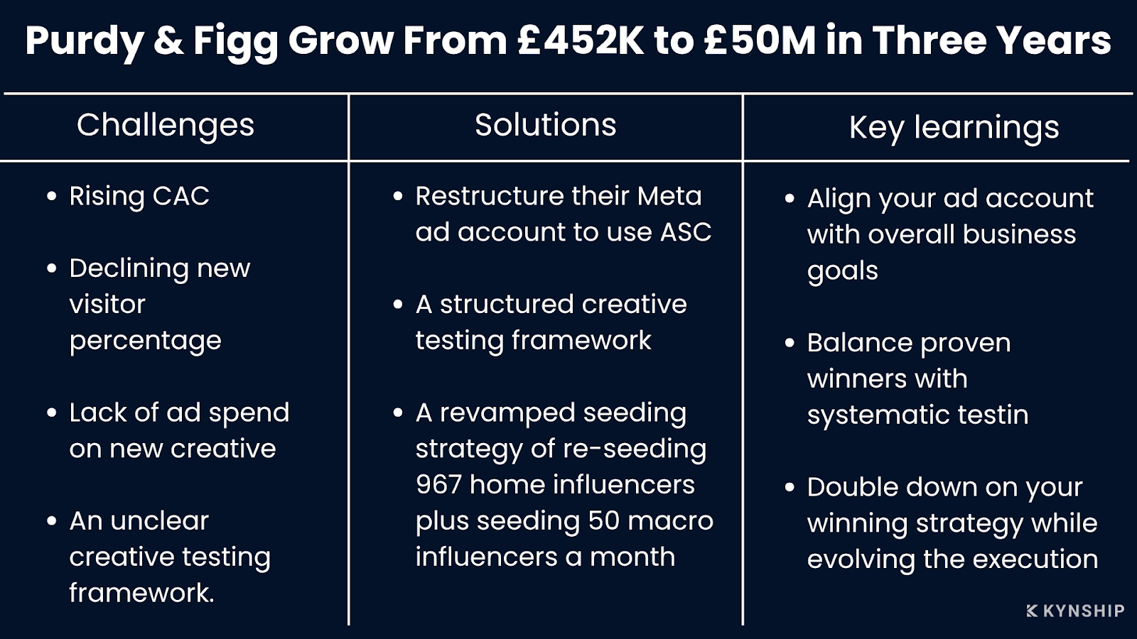But new growth meant new challenges. As 2024 progressed, Purdy & Figg saw rising CAC, declining new visitor percentage, lack of ad spend on new creative, and an unclear creative testing framework.