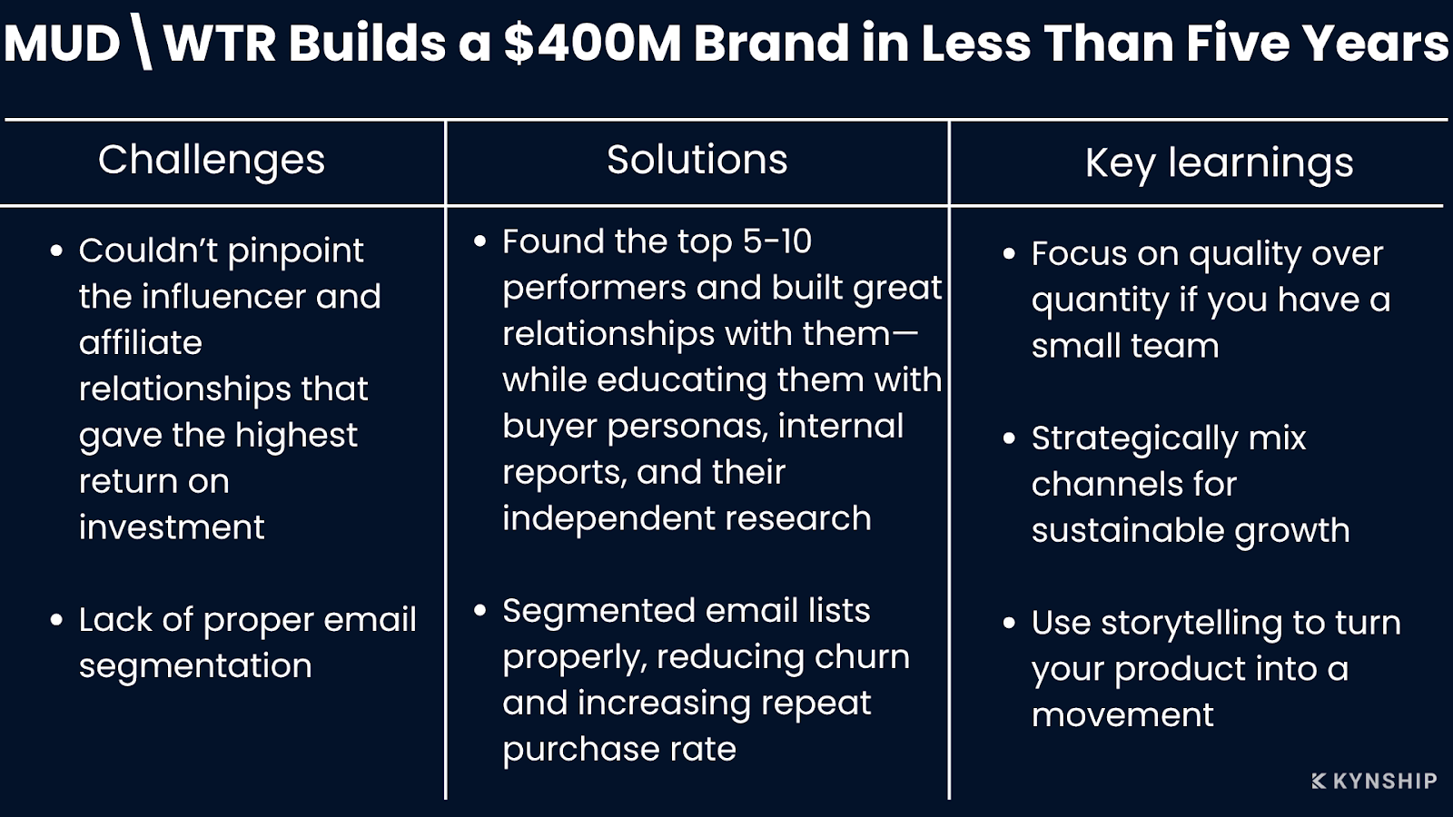 - Strategically mix channels for sustainable growth: MUD\WTR didn’t just focus on influencer collaborations. They combined those efforts with a variety of channels—email marketing, podcast ads, and paid social—to amplify their impact. Coordinate multiple channels with consistent messaging so they can feed off of each other.