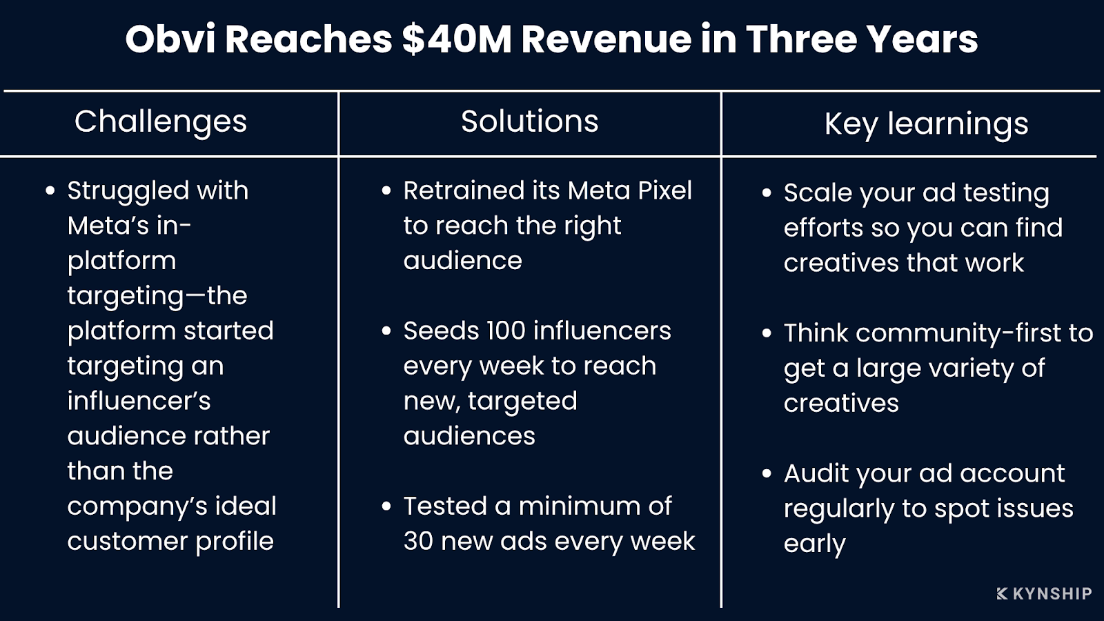 It wasn’t always this smooth sailing, though. Obvi struggled with Meta’s in-platform targeting when the platform started targeting an influencer’s audience rather than the company’s ICP. This continued for a year before the company brought in Proxima AI to retrain its Meta pixel. Once they refined their audience, Obvi also worked to reach new audiences to expand its reach. This expansion, combined with retargeting, led to: