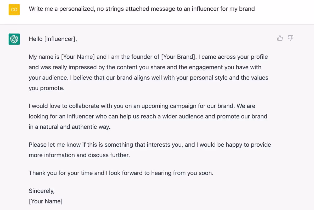 💡ChatGPT Prompt: "Write me a personalized, no strings attached message to an influencer for my brand."